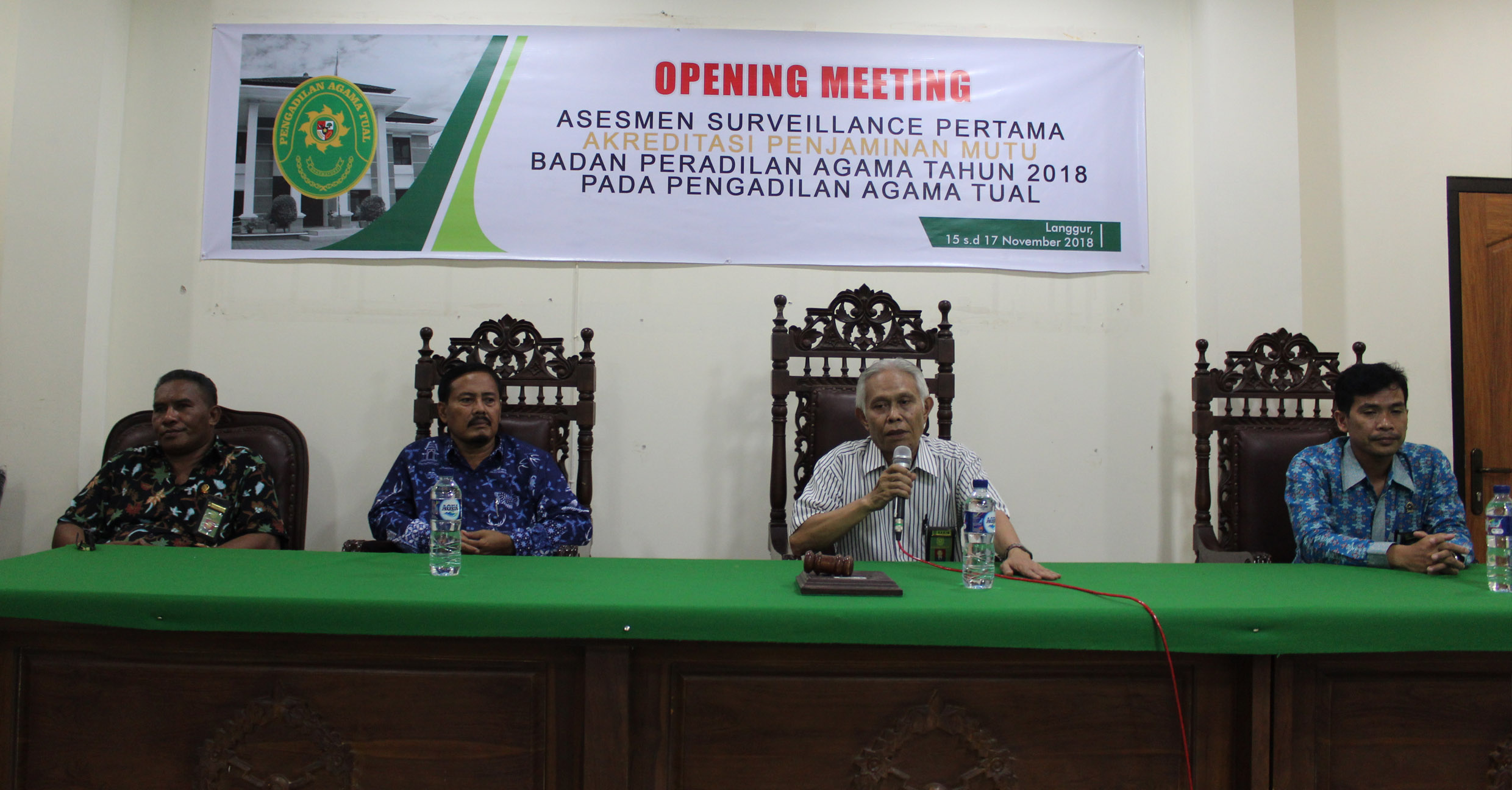 Adapun yang bertindak sebagai assessor ekternal dari PTA Ambon yakni Ismail Difinubun, S.Ag.,MH dan didampingi oleh Tim dari PTA Ambon. Opening meeting di awali oleh sambutan Ketua PA Tual, Dahron, S.Ag.,.S.I., Ketua TPM PA Tual dan dibuka langsung oleh Ketua PTA Ambon, Dr. H. Nurdin Juddah, SH.,MH. Dalam opening meeting ini diberi pengarahan tentang pelaksanaan asesmen surveillance pertama, terkait hal apa yang harus dipersiapkan selama asesmen yang dilaksanakan.